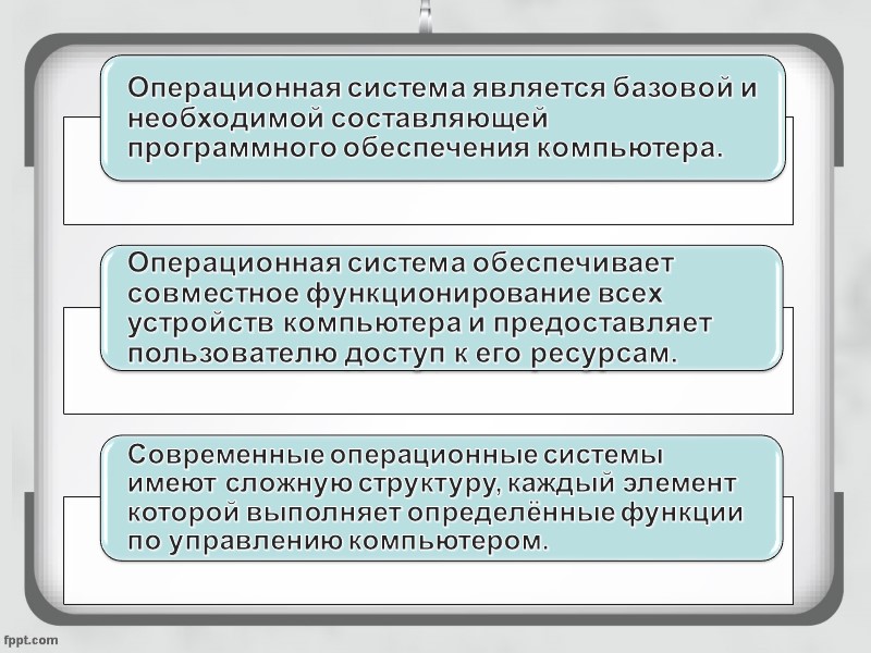 Командный процессор В состав операционной системы входит специальная программа — командный процессор, которая запрашивает у пользователя команды и выполняет их. Пользователь может дать команду запуска программы, выполнения какой-либо операции над файлами, вывода документа на печать. Операционная система должна эту команду выполнить.