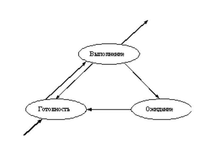 Состояние процессов • ВЫПОЛНЕНИЕ - активное состояние процесса, во время которого процесс обладает всеми необходимыми ресурсами и непосредственно выполняется процессором; • ОЖИДАНИЕ - пассивное состояние процесса, процесс заблокирован, он не может выполняться по своим внутренним причинам, он ждет осуществления некоторого события, например, завершения операции ввода-вывода, получения сообщения от другого процесса, освобождения какого-либо необходимого ему ресурса; • ГОТОВНОСТЬ - также пассивное состояние процесса, но в этом случае процесс заблокирован в связи с внешними по отношению к нему обстоятельствами: процесс имеет все требуемые для него ресурсы, он готов выполняться, однако процессор занят выполнением другого процесса.