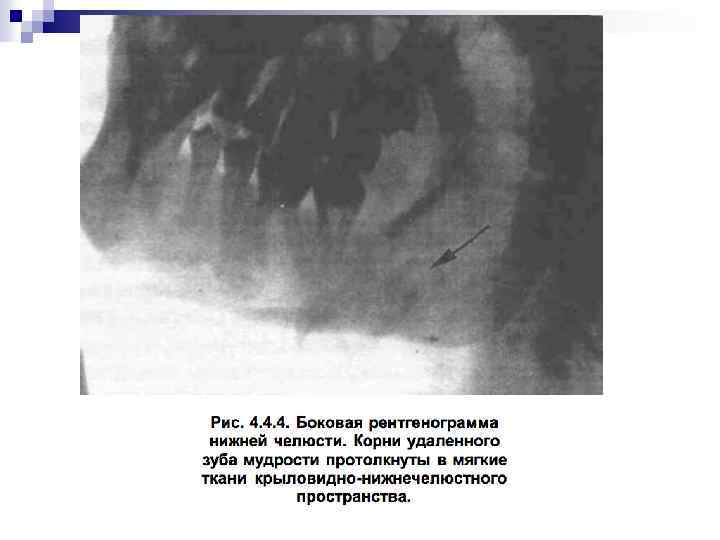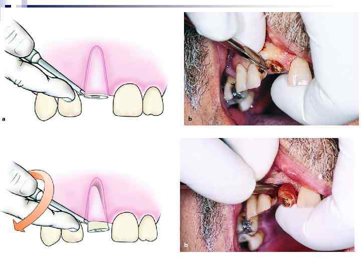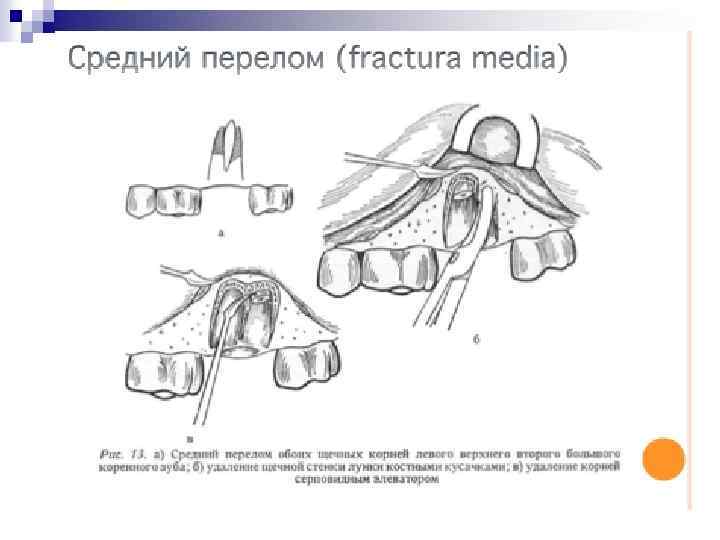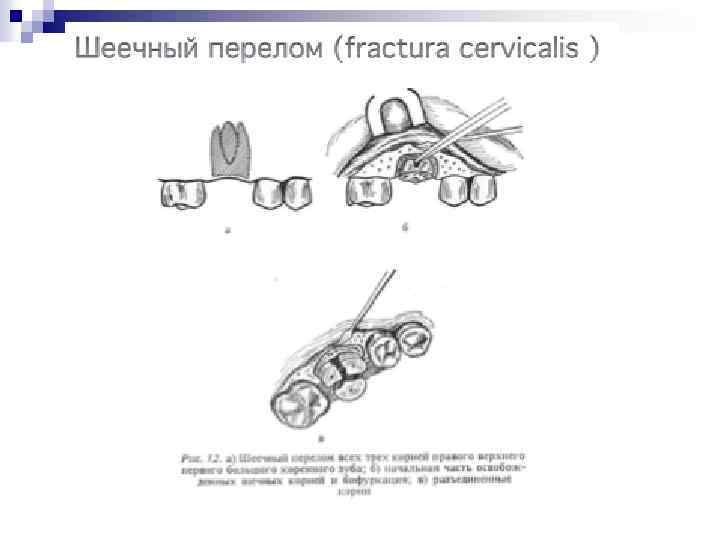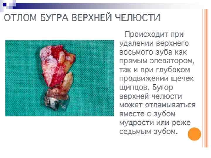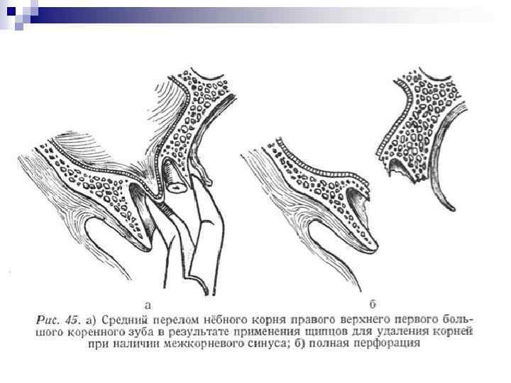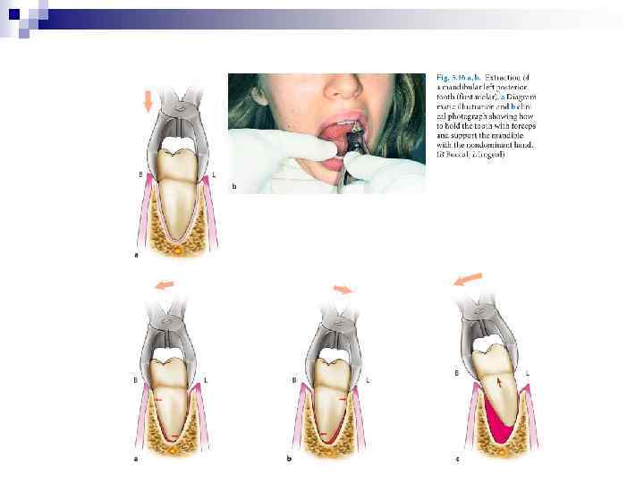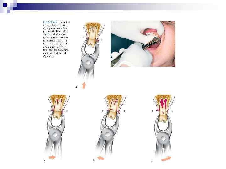 Извлечение зуба из лунки (тракция). Является заключительным этапом в операции удаления зуба. После полного отделения корня зуба от удерживающих связок проводят его извлечение. Зуб извлекают плавно, без рывков, чаще наружу, реже вовнутрь. Вверх или вниз, в зависимости от расположения зуба на нижней или верхней челюсти. При чрезмерном усилии врача в момент извлечения зуба щипцы могут с силой ударить по зубам противоположной челюсти, повредив их или же слизистую оболочку. Удаление зуба завершают сближением краев послеоперационной раны путем сдавления их пальцами правой руки, т. е. врач производит репозицию фрактуированных краев альвеолярного отростка челюсти. Это способствует уменьшению степени зияния послеоперационной