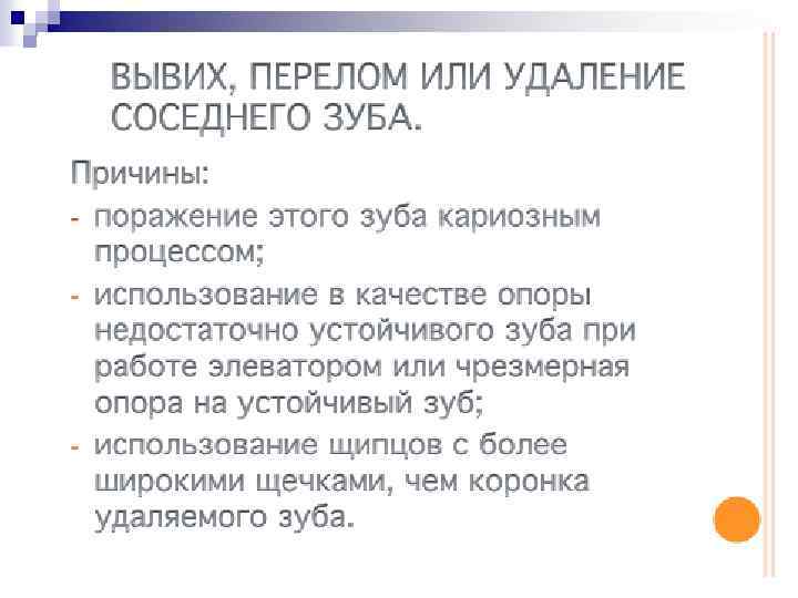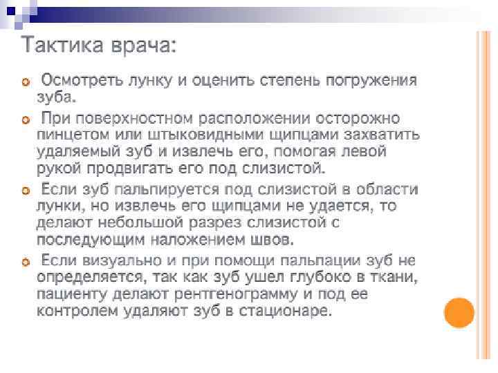 Показания к плановому удалению зуба следующие: 1. 2. 3. 4. Безуспешность эндодонтического лечения при наличии хронического воспалительного очага в периодонтите и окружающей кости. Это вмешательство особенно показано при хронической интоксикации организма больного из одонтогенных очагов инфекции (хронический сепсис) Невозможность консервативного лечения из за значительного разрушения коронки зуба или технических трудностей, связанных с анатомическими особенностями (непроходимые или искривленные каналы корней), погрешности лечения, вызвавшие перфорацию корня или полости зуба. Полное разрушение коронковой части зуба, невозможность использовать оставшийся корень для зубного протезирования. Подвижность 3 4 степени и выдвижение зуба вследствие резорбции кости вокруг альвеолы при тяжелой форме пародонтита и пародонтоза.