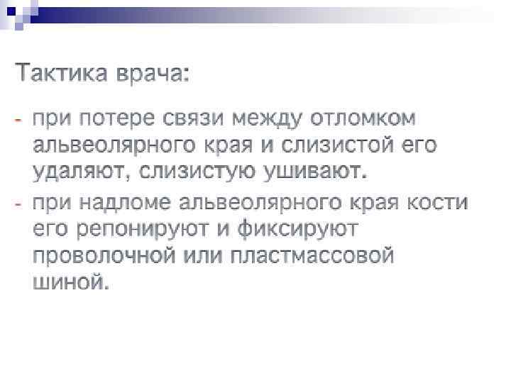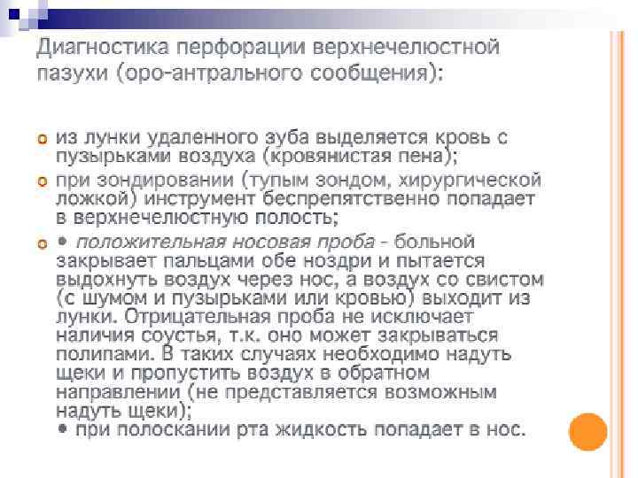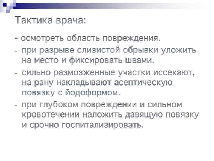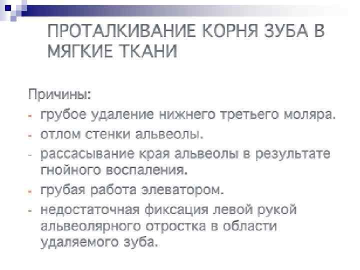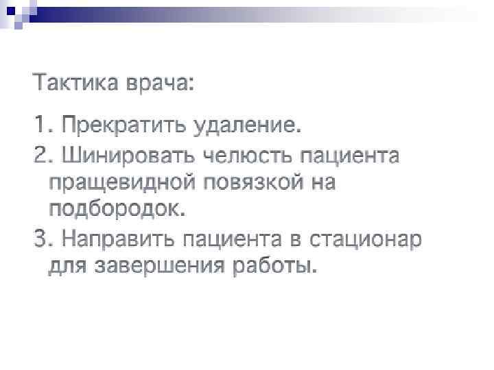 Рекомендации n n n После заполнения кровью лунки необходимо поверх нее наложить (без давления) стерильный марлевый шарик. Больному предлагают удалить его через 15 мин. Рекомендуется в течение 2 ч воздерживаться от пищи, чтобы не разрушить образовавшийся тромб. Прием горячей пищи противопоказан в течение всего дня, так как может возникнуть кровотечение. Полоскание полости рта в ближайшие сутки не показано. В тех случаях, когда удаление зуба или корня производилось по поводу острого воспалительного процесса (острый гнойный периодонтит, флегмона, периостит, остеомиелит челюсти), тем более, когда из лунки после удаления выделяется гной, кюретаж ее абсолютно противопоказан, так как может способствовать обострению процесса. В таких случаях назначают тепловое полоскание растворами лактата, этакридина, перманганата калия, фурацилина на фоне общего лечения.