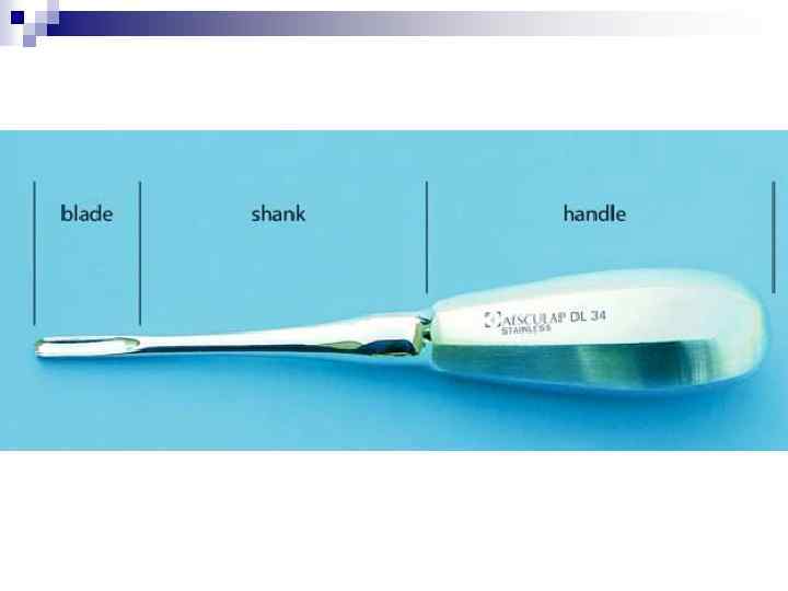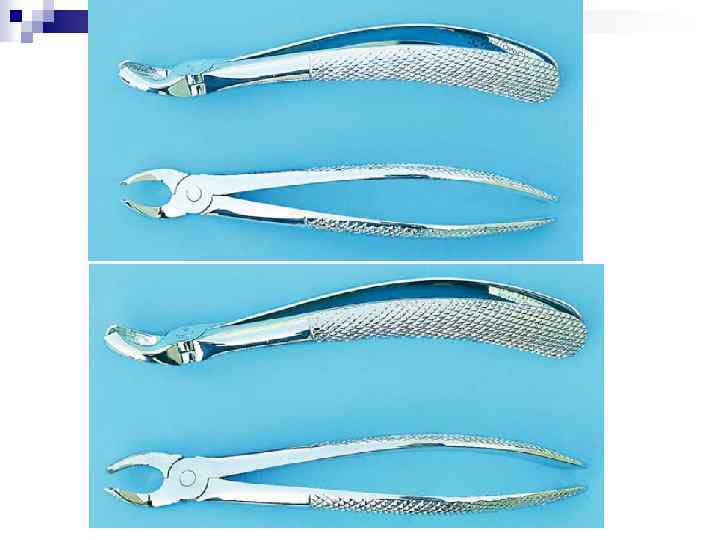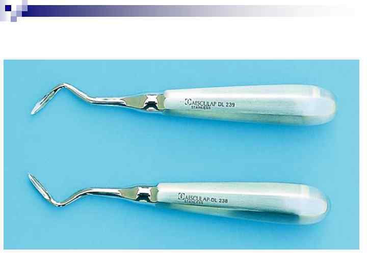 n n Элеваторы Прямой элеватор применяют в тех случаях, когда удаление щипцами связано с затруднениями (значительное разрушение коронки зуба, корней зуба, плохое открывание рта). Боковые элеваторы используют для удаления корней нижних моляров после того, как один из корней зуба удален, а другой удалить щипцами не удается.