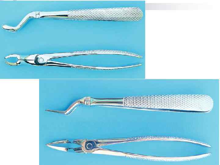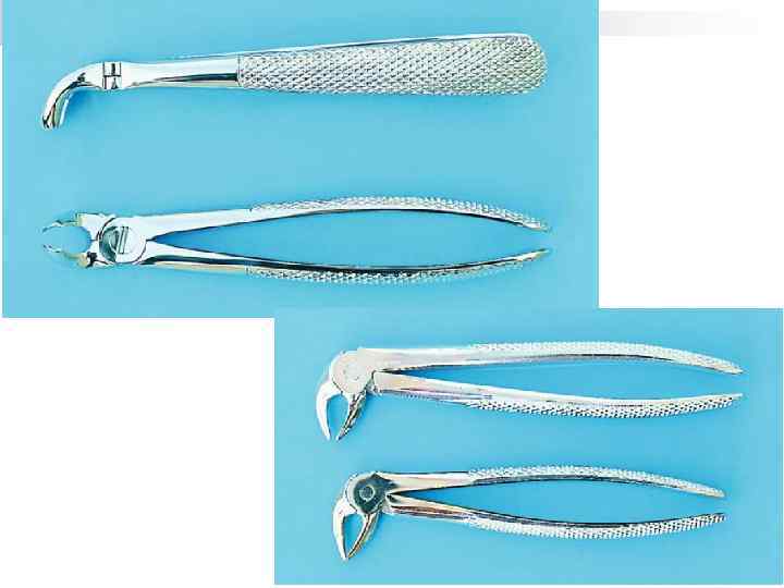 • Для удаления больших коренных зубов используют клювовидные щипцы с широкими щечками и шипами, которые входят между корнями. Раскачивающие движения осуществляют в зависимости от толщины стенок лунки удаляемого зуба. При удалении шестого зуба первые движения делают в щечную сторону, а затем в язычную. При удалении седьмого сначала в язычную, а затем в щечную сторону. Расшатывающие движения осуществляем плавно, без рывков, чтобы не сломать корень зуба. Вращательные движения не используются. • Удаляя корни нижних моляров можно применять как клювовидные смыкающиеся щипцы, так и прямые элеваторы. Если один из корней удален, то в его лунку вводят боковой элеватор, вогнутой частью обращенный в сторону межкорневой перегородки (не удаленного корня), а выпуклой частью опирается о стенку альвеолы удаленного корня. После удаления межкорневой перегородки удается боковым (угловым) элеватором вывихнуть неудаленный корень зуба.