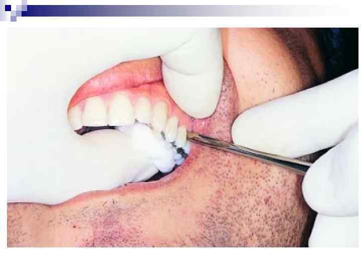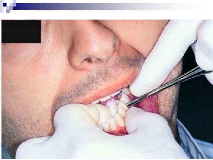 Подготовка операционного поля. n Перед операцией производят механическое удаление налета и пищевых остатков со слизистой оболочки и зубов. Снимают зубные отложения с удаляемого зуба и расположенных рядом зубов. С этой целью их протирают марлевым тампоном, смоченным антисептическим раствором. Очень важно, чтобы перед удалением зуба гигиеническое состояние было адекватным. Больному дают полоскание 0, 12 % хлоргексидином или 0, 04 % элюдрилом, которые уничтожают 90 % патогенной микрофлоры полости рта. Если не проведены предоперационные гигиенические мероприятия, то во время вмешательства зубной налет, камень могут попасть в лунку зуба и инфицировать ее. Когда предстоит сложное удаление зуба, в том числе путем выпиливания, кожу лица больного обрабатывают 70 % этиловым спиртом или 0, 5 % спиртовым раствором хлоргексидина биглюконата, накрывают стерильным полотенцем или специальной стерильной накидкой. Если удаление зуба не имеет характера срочной операции, подготовку полости рта к вмешательству проводят заранее: снимают наддесневой и поддесневой зубной камень, промывают десневой карман дезинфицирующими растворами, контролируют индекс гигиены. Это позволяет в большей степени избежать осложнений после удаления зуба.