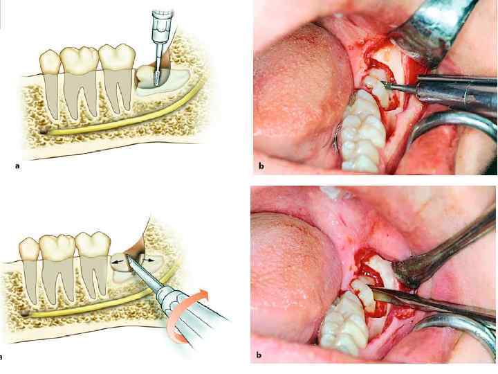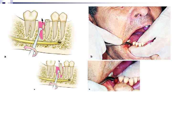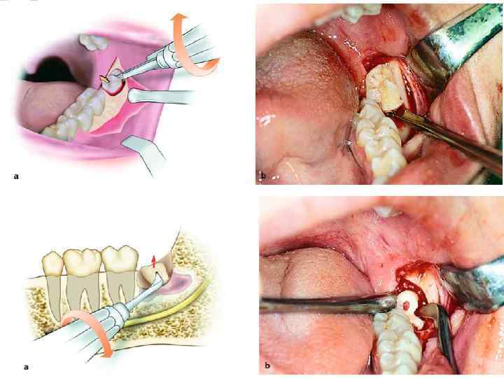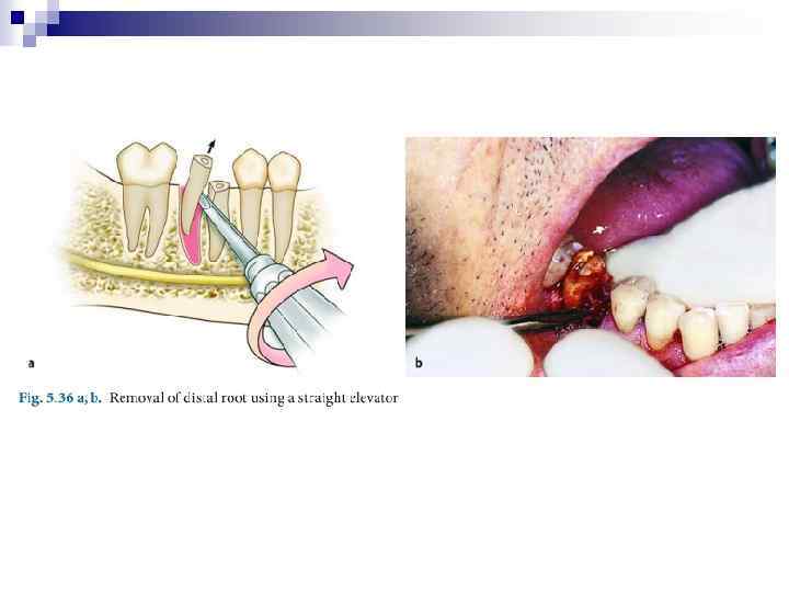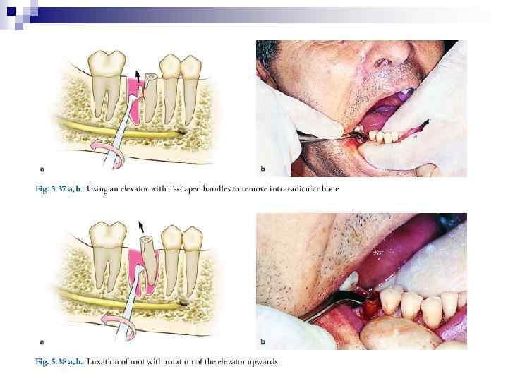 Удаление нижнего моляра прямым элеватором. При удаленном медиальном корне левого нижнего моляра или дистальном корне правого нижнего моляра для удаления оставшегося корня применяется боковой (угловой) элеватор, вогнутая поверхность щечки последнего обращена вправо (от себя), а при удаленном дистальном корне левого нижнего моляра или медиальном корне правого нижнего моляра элеватор, вогнутая поверхность щечки которого обращена влево (к себе).