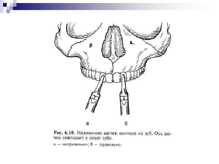 Наложение щипцов. Держа щипцы в руке одним из ранее названных способов, раскрывают щечки их так, чтобы коронка зуба или корень могли поместиться между ними. Одна щечка щипцов накладывается с язычной (нёбной), другая с щечной стороны зуба. Ось щипцов должна совпадать с осью зуба. Несовпадение оси щипцов и зуба ведет к перелому корня или травме соседнего зуба. Продвижение щечек щипцов. Давлением правой руки на щипцы продвигают щечки под десну. На нижней челюсти это обеспечивается за счет давления большим пальцем левой руки на область замка щипцов, на верхней за счет давления на ручки щипцов. Щечки продвигают до ощущения плотного обхвата зуба. Если коронка зуба разрушена, то щечки щипцов продвигают так, чтобы они обхватили края стенки лунки (альвеолы). При удалении зуба эти участки альвеолярного края обламываются, т. е. происходит субпериостальная резекция краев лунки.
