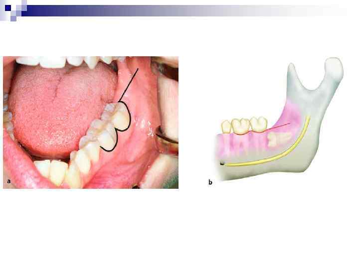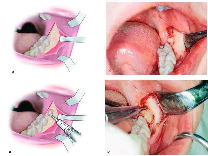 Удаление нижних больших коренных зубов. Первый и второй моляры имеют по два корня (чаще всего, возможны в 50 35 % случаев различные вариации!!!) : медиальный (более мощный) и дистальный. Стенки лунок этих зубов толстые и плотные. У первого моляра наружная и внутренняя лунки одинаковой толщины, у второго моляра наружная стенка толще за счет утолщения челюсти в области наружной косой линии, а язычная стенка более тонкая.