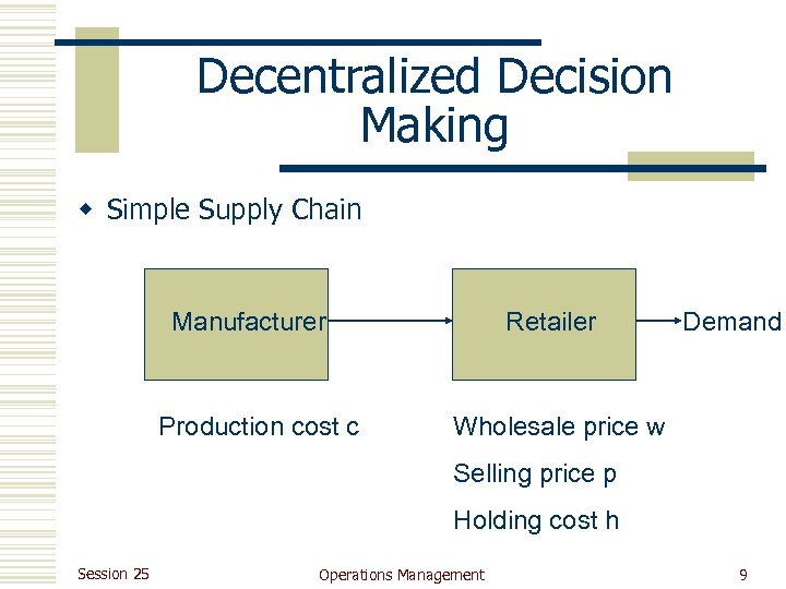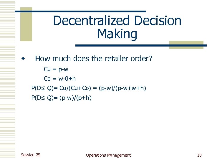 Decentralized Decision Making w Simple Supply Chain Manufacturer Production cost c Retailer Demand Wholesale price w Selling price p Holding cost h Session 25 Operations Management 9