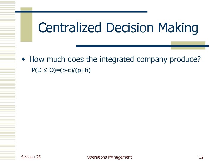 Centralized Decision Making What if the supply chain was vertically integrated? Manufacturer acquired retailer. Manufacturer Production cost c Retailer Demand Wholesale price w becomes irrelev Selling price p Holding cost h Session 25 Operations Management 11