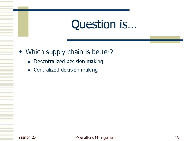 Question is… w Which supply chain is better? n Decentralized decision making n Centralized decision making Session 25 Operations Management 13