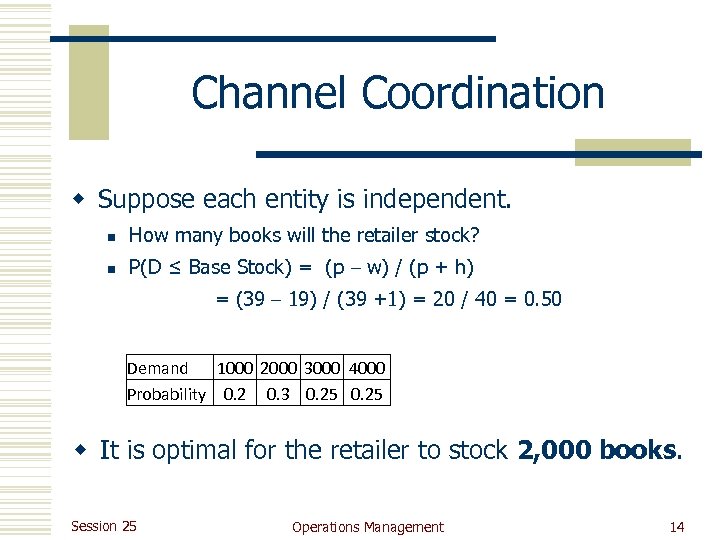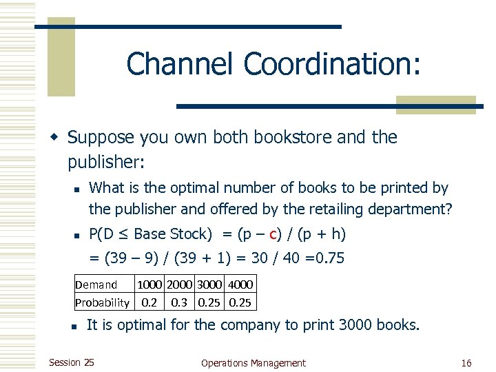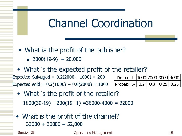 Channel Coordination w Suppose each entity is independent. n How many books will the retailer stock? n P(D ≤ Base Stock) = (p – w) / (p + h) = (39 – 19) / (39 +1) = 20 / 40 = 0. 50 Demand 1000 2000 3000 4000 Probability 0. 2 0. 3 0. 25 w It is optimal for the retailer to stock 2, 000 books. Session 25 Operations Management 14