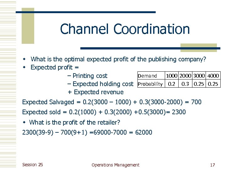 Channel Coordination: w Suppose you own both bookstore and the publisher: n n What is the optimal number of books to be printed by the publisher and offered by the retailing department? P(D ≤ Base Stock) = (p – c) / (p + h) = (39 – 9) / (39 + 1) = 30 / 40 =0. 75 Demand 1000 2000 3000 4000 Probability 0. 2 0. 3 0. 25 n It is optimal for the company to print 3000 books. Session 25 Operations Management 16