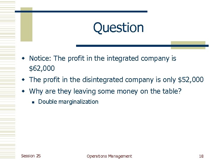 Question w Notice: The profit in the integrated company is $62, 000 w The profit in the disintegrated company is only $52, 000 w Why are they leaving some money on the table? n Double marginalization Session 25 Operations Management 18