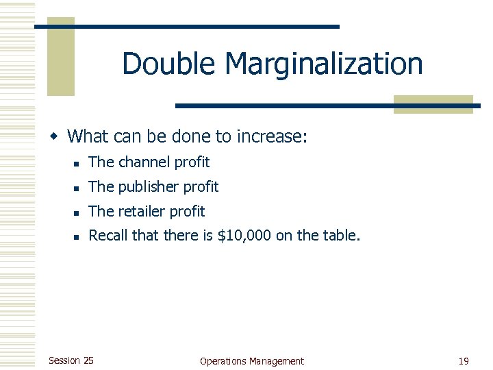 Double Marginalization w What can be done to increase: n The channel profit n The publisher profit n The retailer profit n Recall that there is $10, 000 on the table. Session 25 Operations Management 19