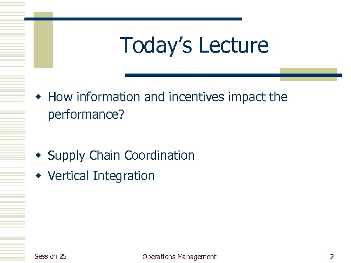 Today’s Lecture w How information and incentives impact the performance? w Supply Chain Coordination w Vertical Integration Session 25 Operations Management 2