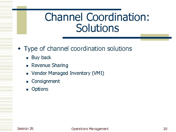 Channel Coordination: Solutions w Type of channel coordination solutions n Buy back n Revenue Sharing n Vendor Managed Inventory (VMI) n Consignment n Options Session 25 Operations Management 20