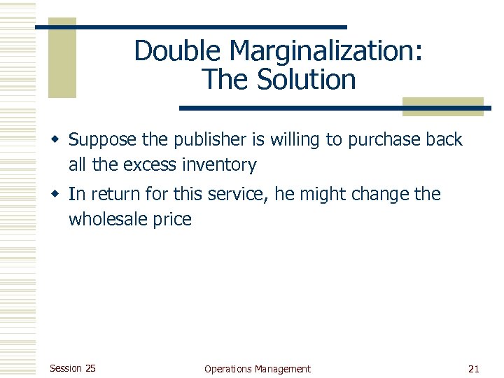 Double Marginalization: The Solution w Suppose the publisher is willing to purchase back all the excess inventory w In return for this service, he might change the wholesale price Session 25 Operations Management 21