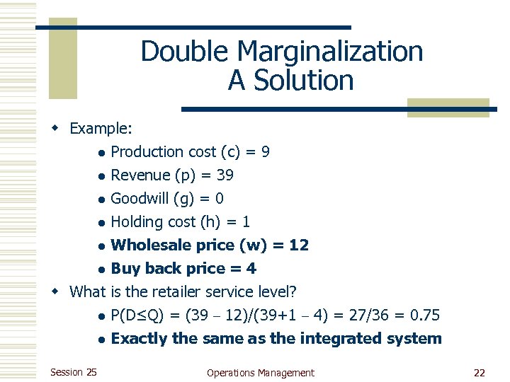 Double Marginalization A Solution w Example: l Production cost (c) = 9 l Revenue (p) = 39 l Goodwill (g) = 0 l Holding cost (h) = 1 l Wholesale price (w) = 12 l Buy back price = 4 w What is the retailer service level? l P(D≤Q) = (39 – 12)/(39+1 – 4) = 27/36 = 0. 75 l Exactly the same as the integrated system Session 25 Operations Management 22