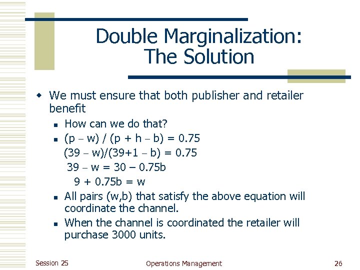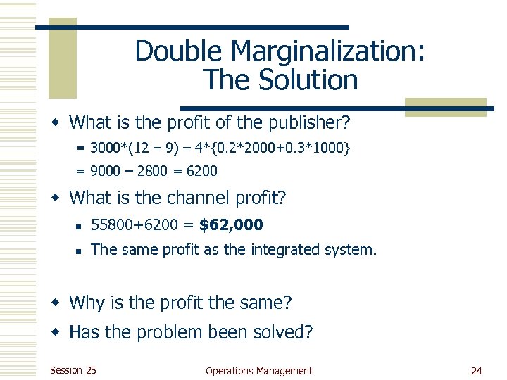 Double Marginalization: The Solution w What is the profit of the publisher? = 3000*(12 – 9) – 4*{0. 2*2000+0. 3*1000} = 9000 – 2800 = 6200 w What is the channel profit? n 55800+6200 = $62, 000 n The same profit as the integrated system. w Why is the profit the same? w Has the problem been solved? Session 25 Operations Management 24