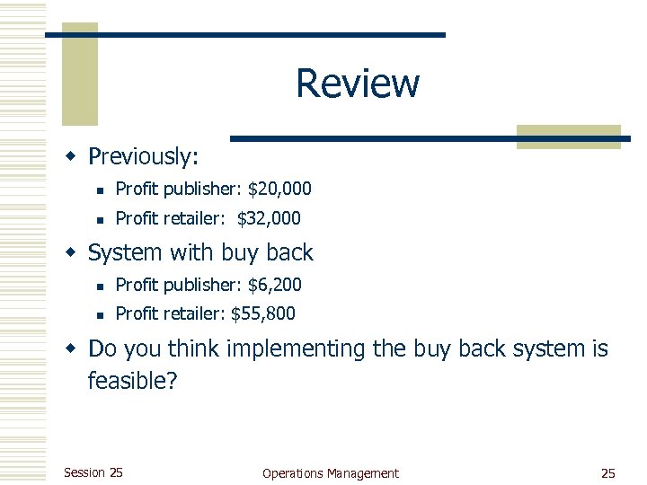 Review w Previously: n Profit publisher: $20, 000 n Profit retailer: $32, 000 w System with buy back n Profit publisher: $6, 200 n Profit retailer: $55, 800 w Do you think implementing the buy back system is feasible? Session 25 Operations Management 25