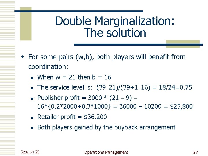 Double Marginalization: The Solution w We must ensure that both publisher and retailer benefit n n How can we do that? (p – w) / (p + h – b) = 0. 75 (39 – w)/(39+1 – b) = 0. 75 39 – w = 30 – 0. 75 b 9 + 0. 75 b = w All pairs (w, b) that satisfy the above equation will coordinate the channel. When the channel is coordinated the retailer will purchase 3000 units. Session 25 Operations Management 26