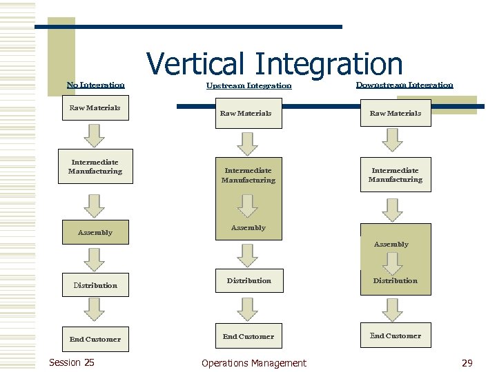 Vertical Integration No Integration Raw Materials Intermediate Manufacturing Assembly Upstream Integration Downstream Integration Raw Materials Intermediate Manufacturing Assembly Distribution End Customer Session 25 Distribution End Customer Operations Management 29