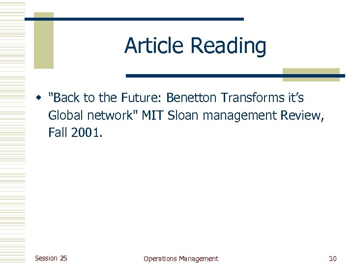 Article Reading w "Back to the Future: Benetton Transforms it’s Global network" MIT Sloan management Review, Fall 2001. Session 25 Operations Management 30