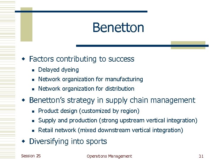 Benetton w Factors contributing to success n Delayed dyeing n Network organization for manufacturing n Network organization for distribution w Benetton’s strategy in supply chain management n Product design (customized by region) n Supply and production (strong upstream vertical integration) n Retail network (mixed downstream vertical integration) w Diversifying into sports Session 25 Operations Management 31