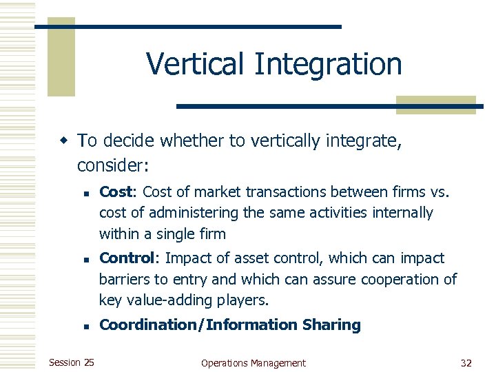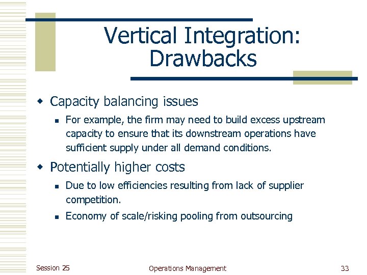 Vertical Integration w To decide whether to vertically integrate, consider: n n n Session 25 Cost: Cost of market transactions between firms vs. cost of administering the same activities internally within a single firm Control: Impact of asset control, which can impact barriers to entry and which can assure cooperation of key value-adding players. Coordination/Information Sharing Operations Management 32