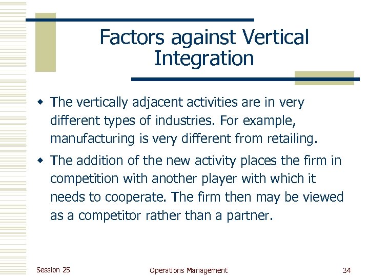 Vertical Integration: Drawbacks w Capacity balancing issues n For example, the firm may need to build excess upstream capacity to ensure that its downstream operations have sufficient supply under all demand conditions. w Potentially higher costs n n Due to low efficiencies resulting from lack of supplier competition. Economy of scale/risking pooling from outsourcing Session 25 Operations Management 33