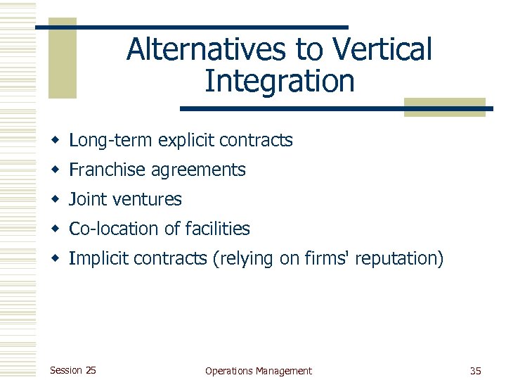 Alternatives to Vertical Integration w Long-term explicit contracts w Franchise agreements w Joint ventures w Co-location of facilities w Implicit contracts (relying on firms' reputation) Session 25 Operations Management 35