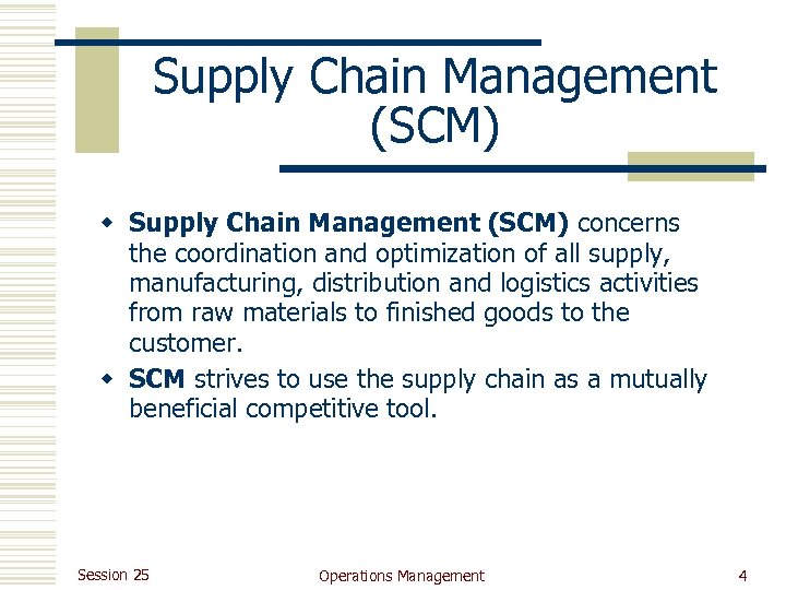 Supply Chain Management (SCM) w Supply Chain Management (SCM) concerns the coordination and optimization of all supply, manufacturing, distribution and logistics activities from raw materials to finished goods to the customer. w SCM strives to use the supply chain as a mutually beneficial competitive tool. Session 25 Operations Management 4