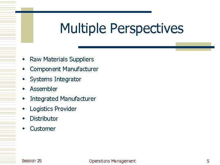 Multiple Perspectives w Raw Materials Suppliers w Component Manufacturer w Systems Integrator w Assembler w Integrated Manufacturer w Logistics Provider w Distributor w Customer Session 25 Operations Management 5