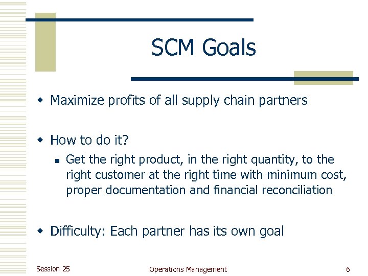 SCM Goals w Maximize profits of all supply chain partners w How to do it? n Get the right product, in the right quantity, to the right customer at the right time with minimum cost, proper documentation and financial reconciliation w Difficulty: Each partner has its own goal Session 25 Operations Management 6