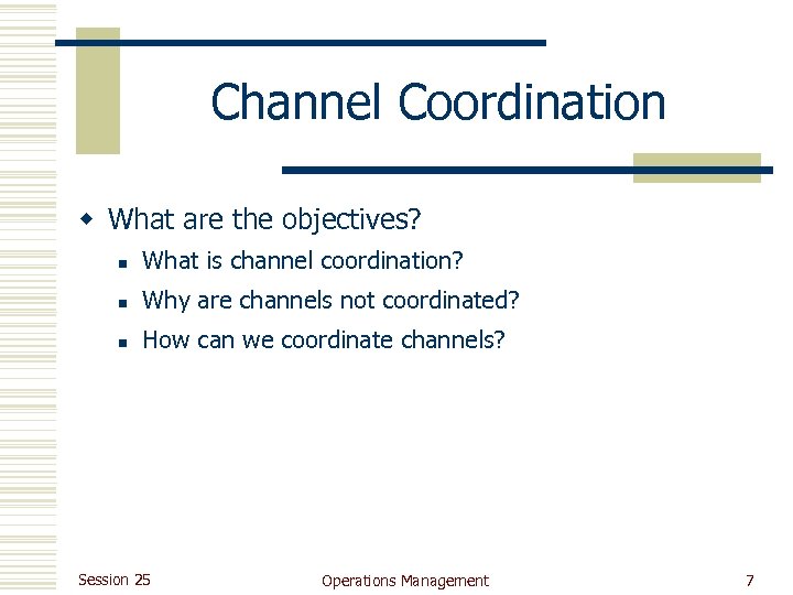 Channel Coordination w What are the objectives? n What is channel coordination? n Why are channels not coordinated? n How can we coordinate channels? Session 25 Operations Management 7
