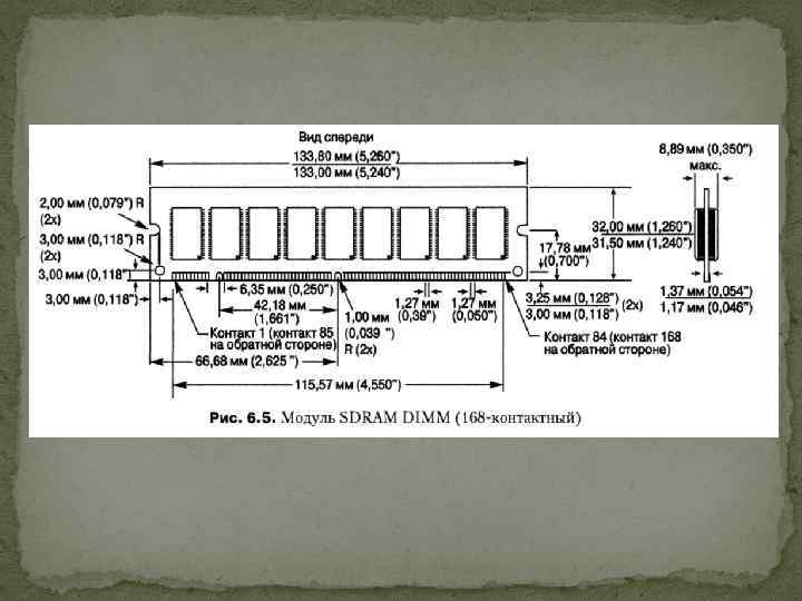 Пам’ять SDRAM Це тип динамічної оперативної пам'яті (DRAM), робота якої синхронізується з шиною пам'яті. SDRAM передає інформацію в пакетах, що використовують високошвидкісний синхронізований інтерфейс. Характеристики модулів пам’яті SDRAM DIMM Довжина циклу, нс Частота, МГц Специфікація 15 66 PC 66 10 100 PC 66 8 125 PC 100 7, 5 133 PC 133 7, 0 143 PC 133