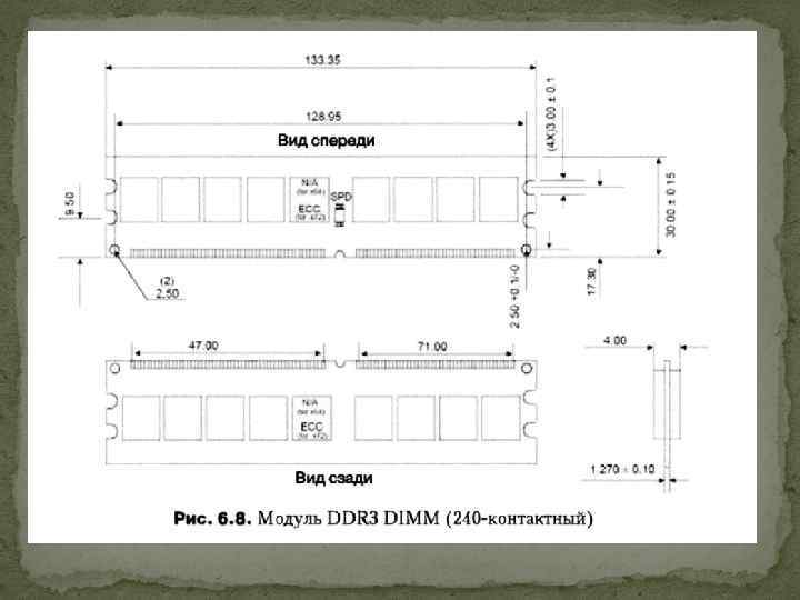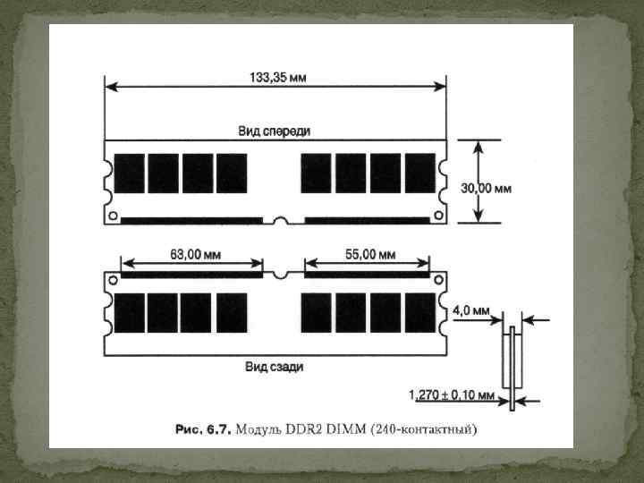 Модулі пам’яті Процесор і архітектура системної плати (набори мікросхем) визначають ємність фізичної пам'яті комп'ютера, а також типи та форму використовуваних модулів пам'яті. За останні роки швидкість передачі даних і швидкість пам'яті значно виросли. Швидкість і розрядність пам'яті визначаються процесором і схемою контролера пам'яті.
