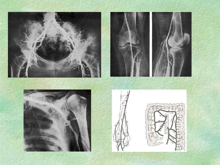 Коллатеральное кровообращение Возможности восстановления кровообращения в зависимости от анатомического развития и функциональной достаточности предсуществующих (анатомических) коллатералей: 1. Анастомозы существуют и достаточно широки, чтобы полностью обеспечить кровоснабжение тканей, несмотря на выключение магистральной артерии - анатомическая и функциональная достаточность коллатералей; 2. Анастомозы слабо развиты или имеются только капиллярные анастомозы (окольное кровообращение не обеспечивает питания периферических отделов, возникает ишемия, а затем некроз) - анатомическая и функциональная недостаточность коллатералей; 3. Анастомозы существуют, но объем поступающей по ним крови мал для полноценного кровоснабжения - функциональная недостаточность коллатералей. Вновь образующиеся коллатерали - преобразование мелких в нормальных условиях не функционирующих мышечных сосудистых артериальных ветвей (vasa vasorum, vasa nervorum) оптимальное развитие к концу второго месяца после повреждения (окклюзии) основного сосуда.