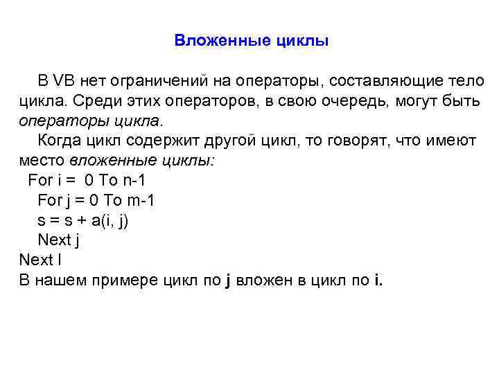 Вложенные циклы В VB нет ограничений на операторы, составляющие тело цикла. Среди этих операторов, в свою очередь, могут быть операторы цикла. Когда цикл содержит другой цикл, то говорят, что имеют место вложенные циклы: For i = 0 To n-1 For j = 0 To m-1 s = s + a(i, j) Next j Next I В нашем примере цикл по j вложен в цикл по i.