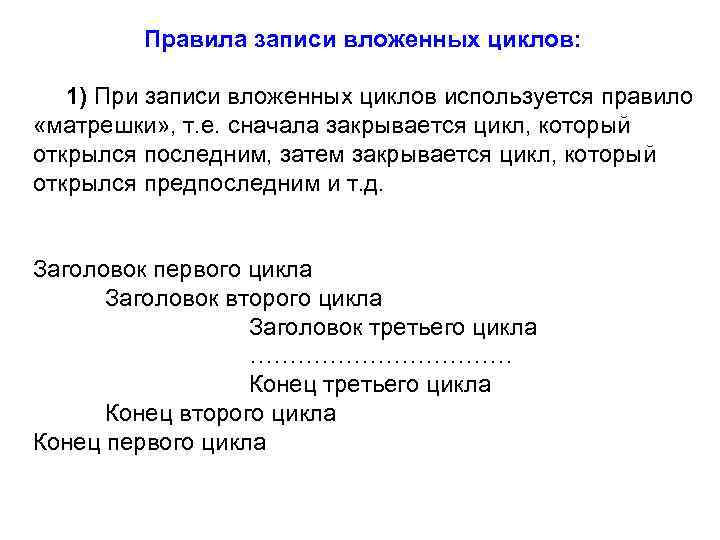 Правила записи вложенных циклов: 1) При записи вложенных циклов используется правило «матрешки» , т. е. сначала закрывается цикл, который открылся последним, затем закрывается цикл, который открылся предпоследним и т. д. Заголовок первого цикла Заголовок второго цикла Заголовок третьего цикла ……………… Конец третьего цикла Конец второго цикла Конец первого цикла