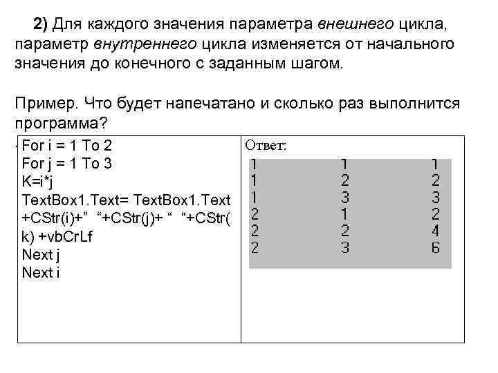 2) Для каждого значения параметра внешнего цикла, параметр внутреннего цикла изменяется от начального значения до конечного с заданным шагом. Пример. Что будет напечатано и сколько раз выполнится программа? . For i = 1 To 2 Ответ: For j = 1 To 3 K=i*j Text. Box 1. Text= Text. Box 1. Text +CStr(i)+” “+CStr(j)+ “ “+CStr( k) +vb. Cr. Lf Next j Next i