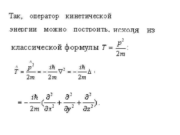 • Оператор Гамильтона для частицы с массой m строится по аналогии с функцией Гамильтона H • H = T+U(x, y, z, t) =