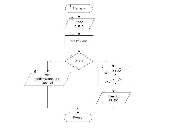 #include #include using namespace std; int main() {float a, b, c, d, x 1, x 2; //Ввод значений коэффициентов квадратного уравнения cout<<"a="; cin>>a; cout<<"b="; cin>>b; cout<<"c="; cin>>c; //Вычисление дискриминанта d=b*b-4*a*c; //Если дискриминант отрицателен, if (d<0) //то вывод сообщения, что корней нет, cout<<"Real roots are not present"; Else {//иначе вычисление корней x 1, x 2 x 1=(-b+sqrt(d))/2/a; x 2=(-b-sqrt(d))/(2*a); //и вывод их значений на экран cout<<"X 1="<