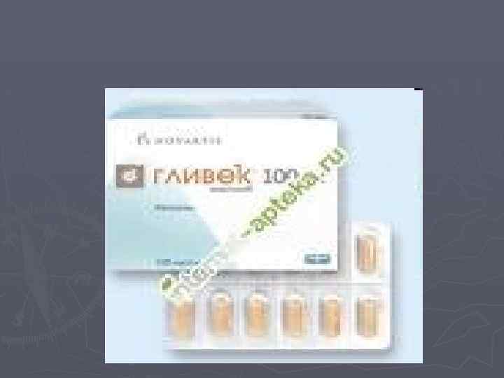 ЭФФЕКТИВНОСТЬ ГЛИВЕКА при ХМЛ Через 3 месяца от начала лечения: ► В хронической фазе –полная гематологическая ремиссия у 98% больных и полная цитогенетическая ремиссия у 50% больных ► В фазе акселерации- полная гематологическая ремиссия у 30% больных и цитогенетическая ремиссия у 17% больных