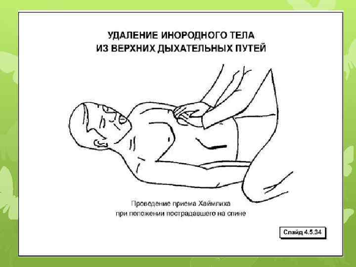 Последние рекомендации предписывают начинать удаление инородного тела (особенно у маленьких детей) с другого приема: - Положить ребенка на свою руку лицом на ладонь, чтобы ножки располагались по разные стороны вашего предплечья и ось тела была наклонена вниз. Производите похлопывания ладонью между лопаток, пока инородное тело не очутится у вас в ладони. При неудаче – проводите прием Геймлиха, как описано выше. Если ребенок не придет в себя, начинайте проведение СЛР по алгоритму. Ребенок должен обязательно должен быть осмотрен врачом, даже при благоприятном исходе