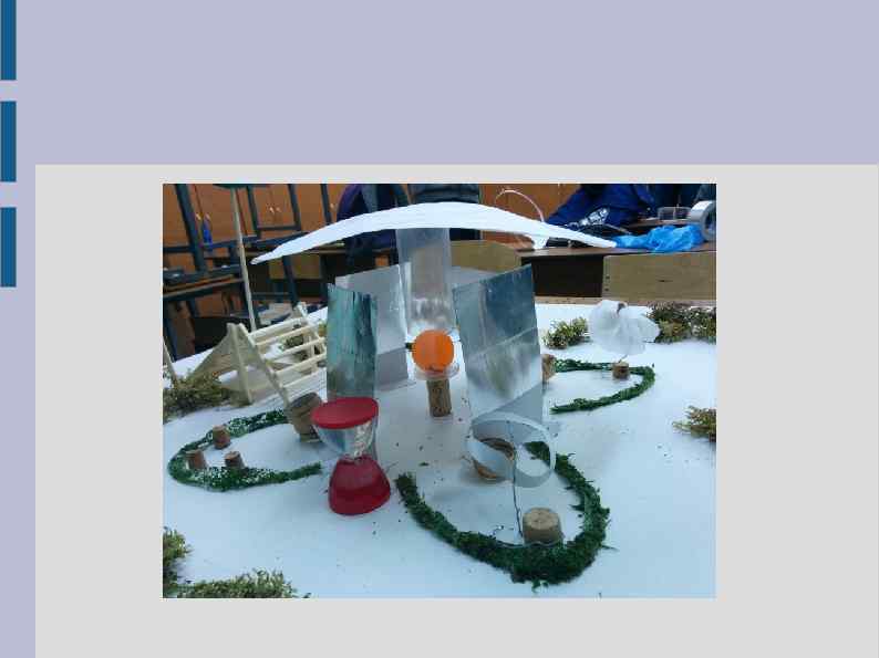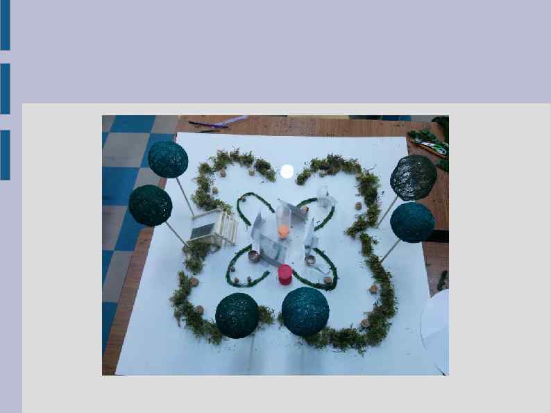 6. Выбор используемых материалов В качестве основы изначально предполагалось использование коробочного картона, оклеенного обоями. Но такая основа оказалась слишком гибкой, пришлось заменить ее на лист ДВП (в целях экономии времени облагороженный ДВП). Прочие материалы: картон, ватман, обои, пластиковые упаковки, проволока, бутылочные пробки (кора пробкового дерева), нитки, двусторонний скотч, клей «Момент-Кристалл» , металлизированный скотч, сухой мох, ткань, деревянные рейки, клеевой пистолет, шарик для пинг-понга.