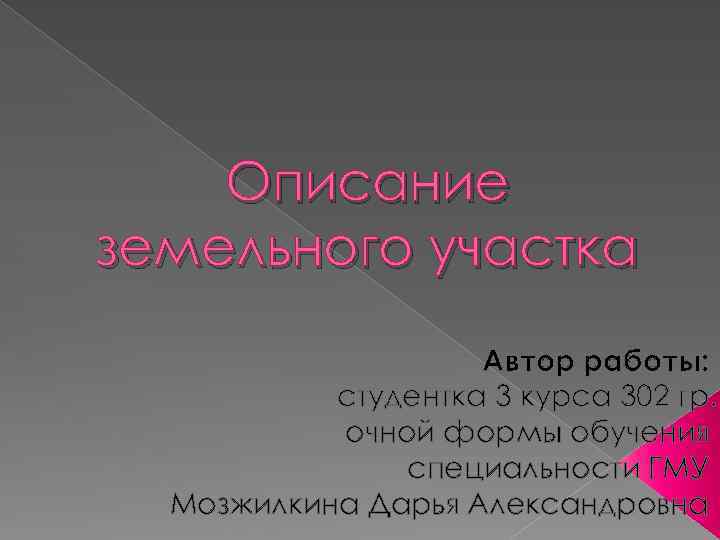 Описание земельного участка Автор работы: студентка 3 курса 302 гр. очной формы обучения специальности ГМУ Мозжилкина Дарья Александровна