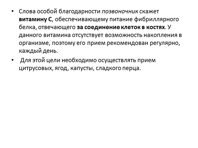 Слова особой благодарности позвоночник скажет витамину C, обеспечивающему питание фибриллярного белка, отвечающего за соединение клеток в костях. У данного витамина отсутствует возможность накопления в организме, поэтому его прием рекомендован регулярно, каждый день. Для этой цели необходимо осуществлять прием цитрусовых, ягод, капусты, сладкого перца.