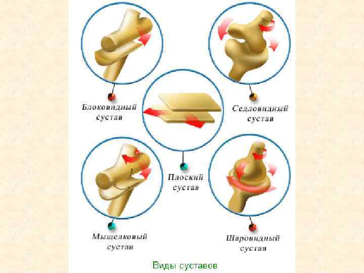 Типы суставов • Одно- двух- многоосные • Простые, сложные • 1 Цилиндрический (атлантоосевой), 1 Блоковидный (межфаланговый) • 2 Элипсовидный (лучезапястный), 2 Мыщелковый (коленный), 2 Седловидный (I запястно-пястный) • 3 Шаровидный (плечевой, тазобедренный) • 3 Плоский (межпозвонковые)