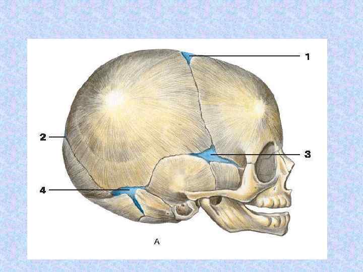 Череп У новорожденного черепные кости соединены друг с другом мягкой соединительнотканной перепонкой. Это - роднички. Роднички располагаются по углам обеих теменных костей; различают непарные лобный и затылочный и парные передние боковые и задние боковые роднички. Малые роднички зарастают к 2 -3 месяцам, а наибольший лобный - легко прощупывается и зарастает лишь к полутора годам.